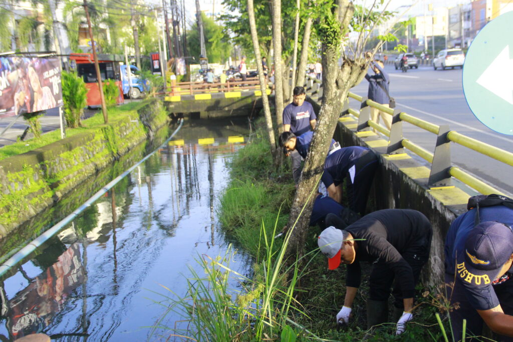Dinas Perhubungan Kota Banjarmasin melaksanakan kegiatan gotong royong bersih-bersih di sepanjang Jalan A. Yani KM 4, mulai dari Jembatan Bulan Mas, Kecamatan Banjarmasin Timur, Banjarmasin.